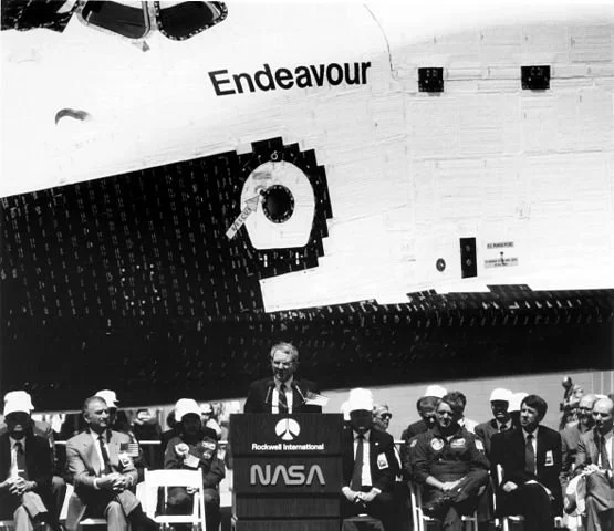 /NASA Administrator Richard H. Truly addresses the audience in attendance at the rollout ceremonies of the Space Shuttle Orbiter Endeavour which occurred on April 25, 1991, at the Rockwell International facility, Palmdale, Calif.